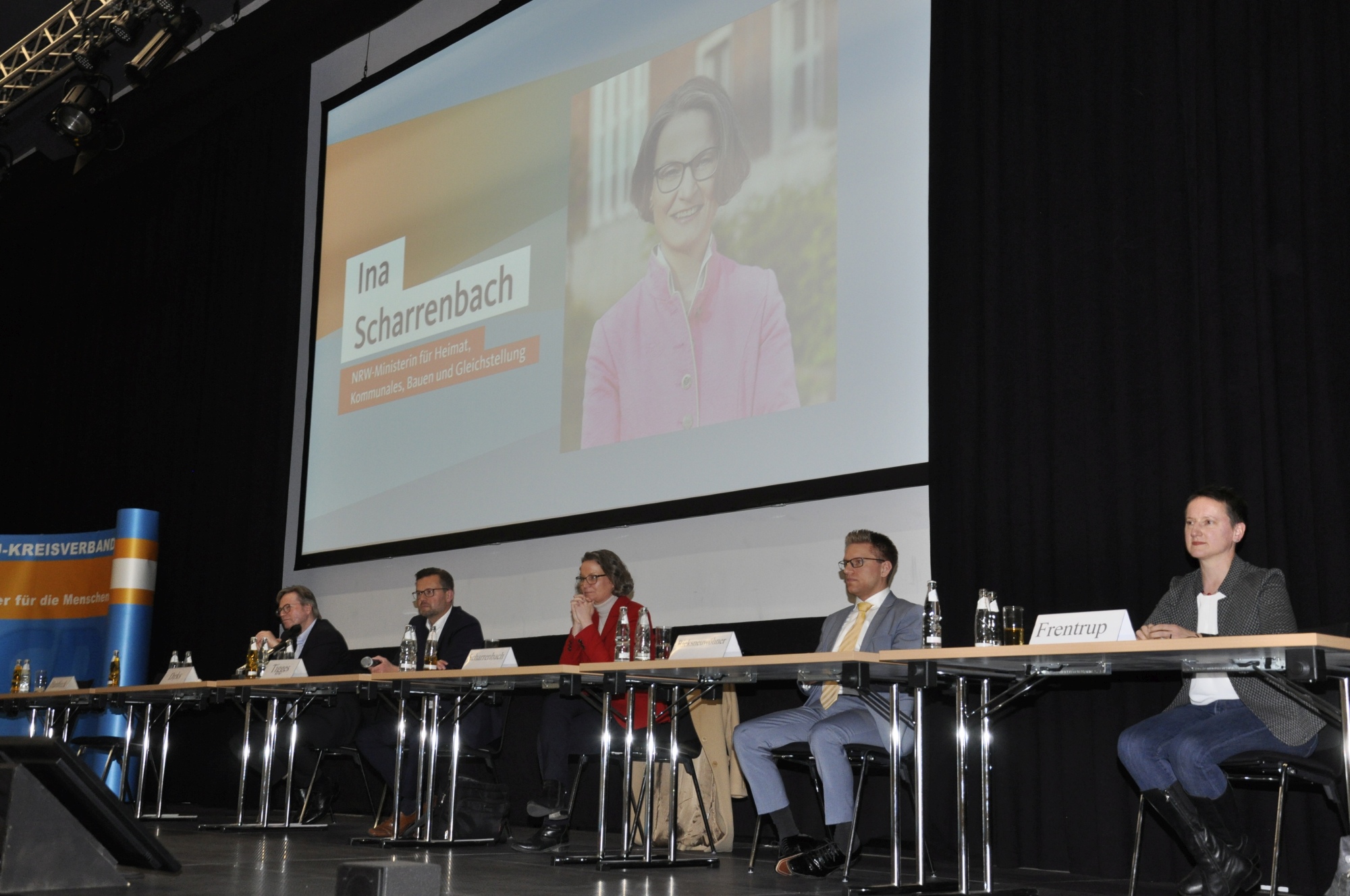 Hauptredner des Abends war Ina Scharrenbach, NRW-Ministerin für Heimat, Kommunales, Bauen und Gleichstellung. Sie nannte die Landtagswahl am 15. Mai ein "Hochamt der Demokratie", und verwies auf die Ukraine, wo für diese Freiheitsrechte mit so viel Herzblut gekämpft werde. In dieser schweren Krise werde der Sinn des Staates wieder sehr deutlich: Vor allem, Sicherheit zu gewähren. Äußere Sicherheit, für die der Bund zuständig ist sowie Innere Sicherheit einschließlich Zivilschutz, was Aufgabe des Landes ist. Dabei verwies sie auf die großen Erfolge der aktuellen Landesregierung in der Verbrechensbekämpfung und der Gefahrenabwehr durch die Arbeit von Minister Reul. Eine weitere Funktion des Staates sei es, die Versorgungssicherheit sicherzustellen, was sich im Wahlprogramm der CDU niederschlage. Auch solle der Landesentwicklungsplan Fortschrittsplan sein, zum Beispiel durch die Ausweisung von Klimaschutzgewerbegebieten.