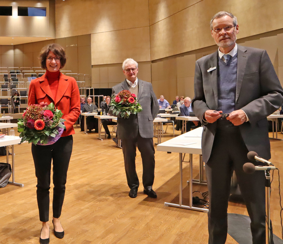 Bei der Vereidigung in der Gütersloher Stadthalle (v.l.): Dr. Christine Disselkamp, Dr. Heinz Josef Sökeland und Landrat Sven-Georg Adenauer. (Foto: Kreis Gütersloh)